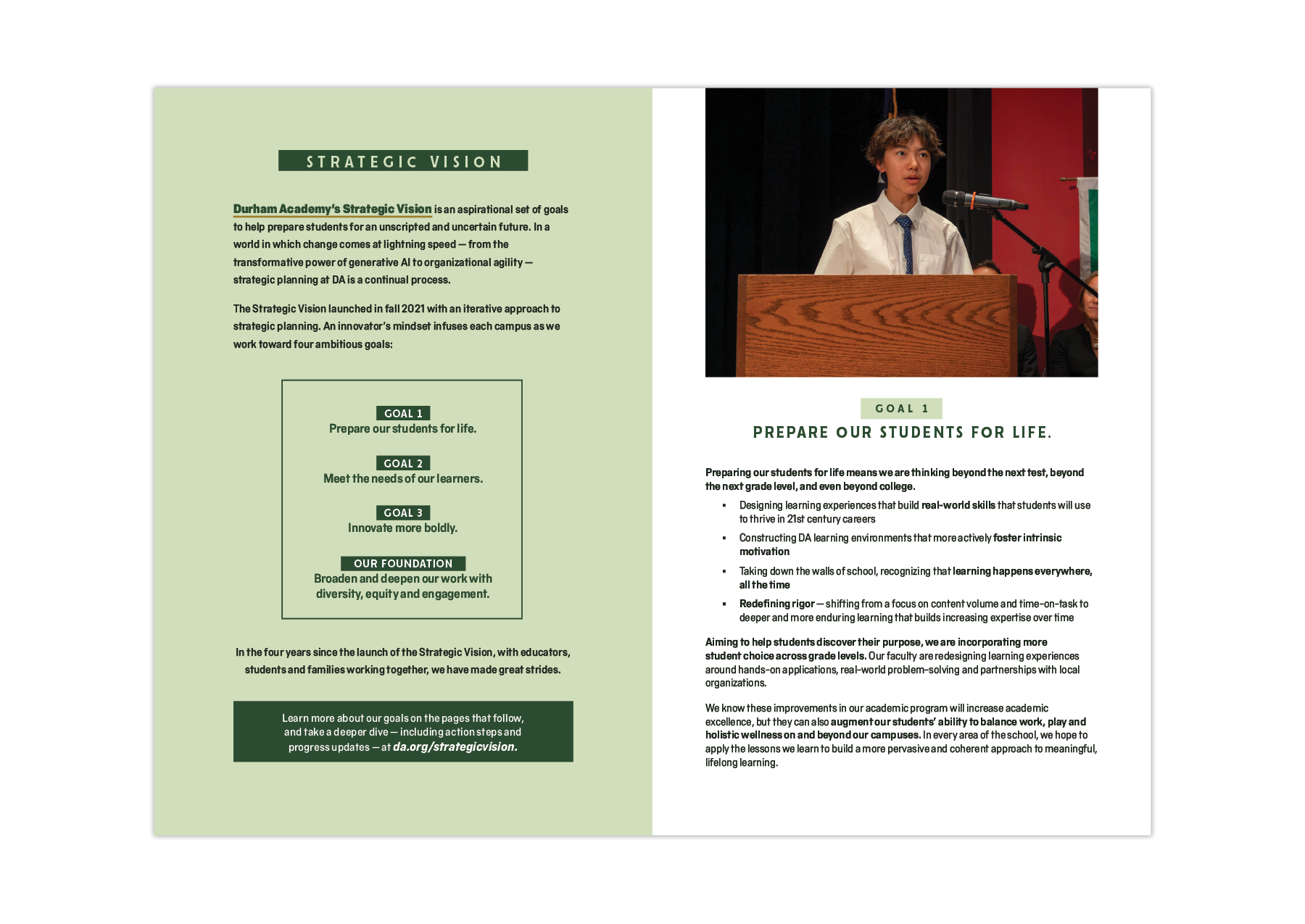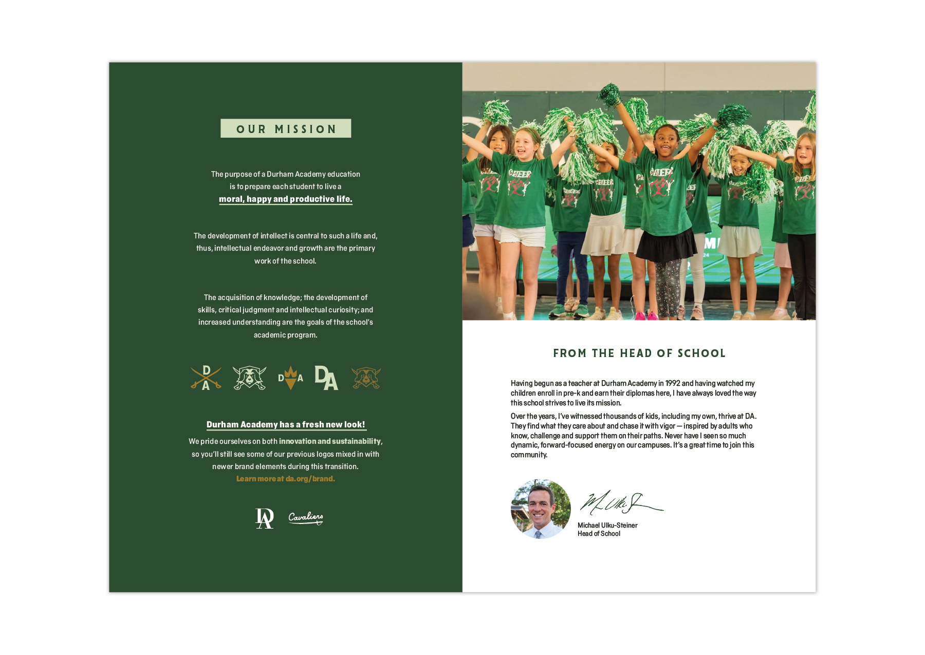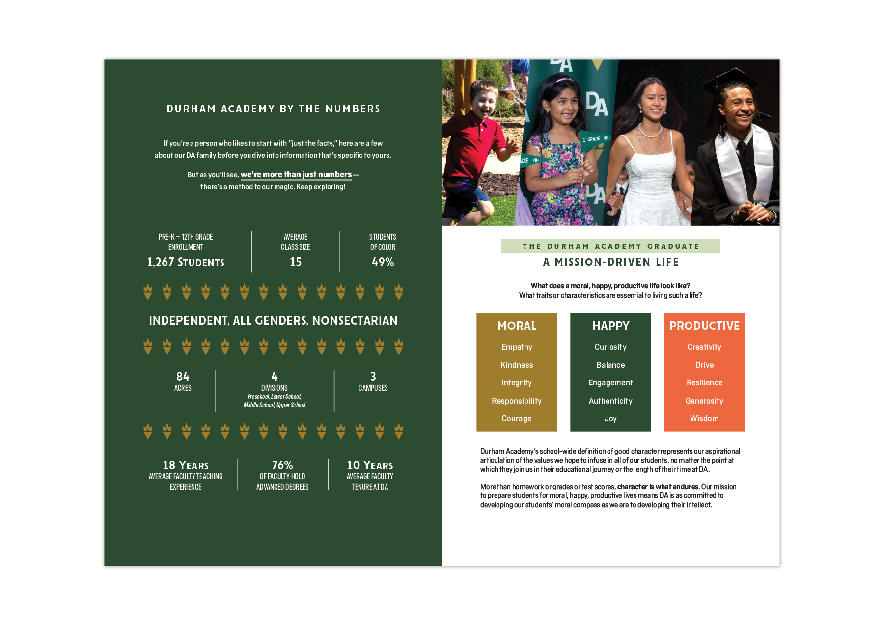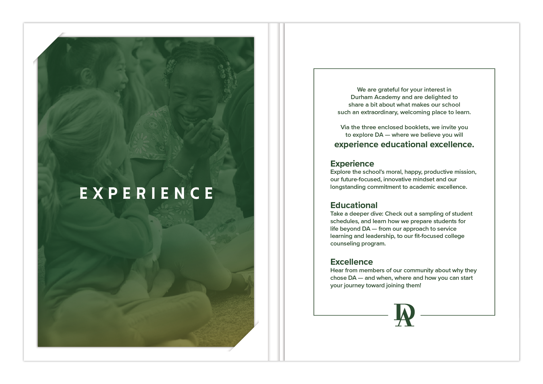 For a 90-year-old institution with a national reputation, our primary admissions collateral wasn't reflecting the caliber of the education we provided. The existing materials—a series of disorganized, fragmented accordion brochures—failed to mirror the sophistication of the school’s strategic direction. In a competitive market where the viewbook often justifies a significant financial investment, the current execution was a missed opportunity to signal quality and rigor. My challenge was to replace this disjointed system with a premium, multi-layered narrative experience that could convince discerning families that Durham Academy is a premier investment in their child’s future.