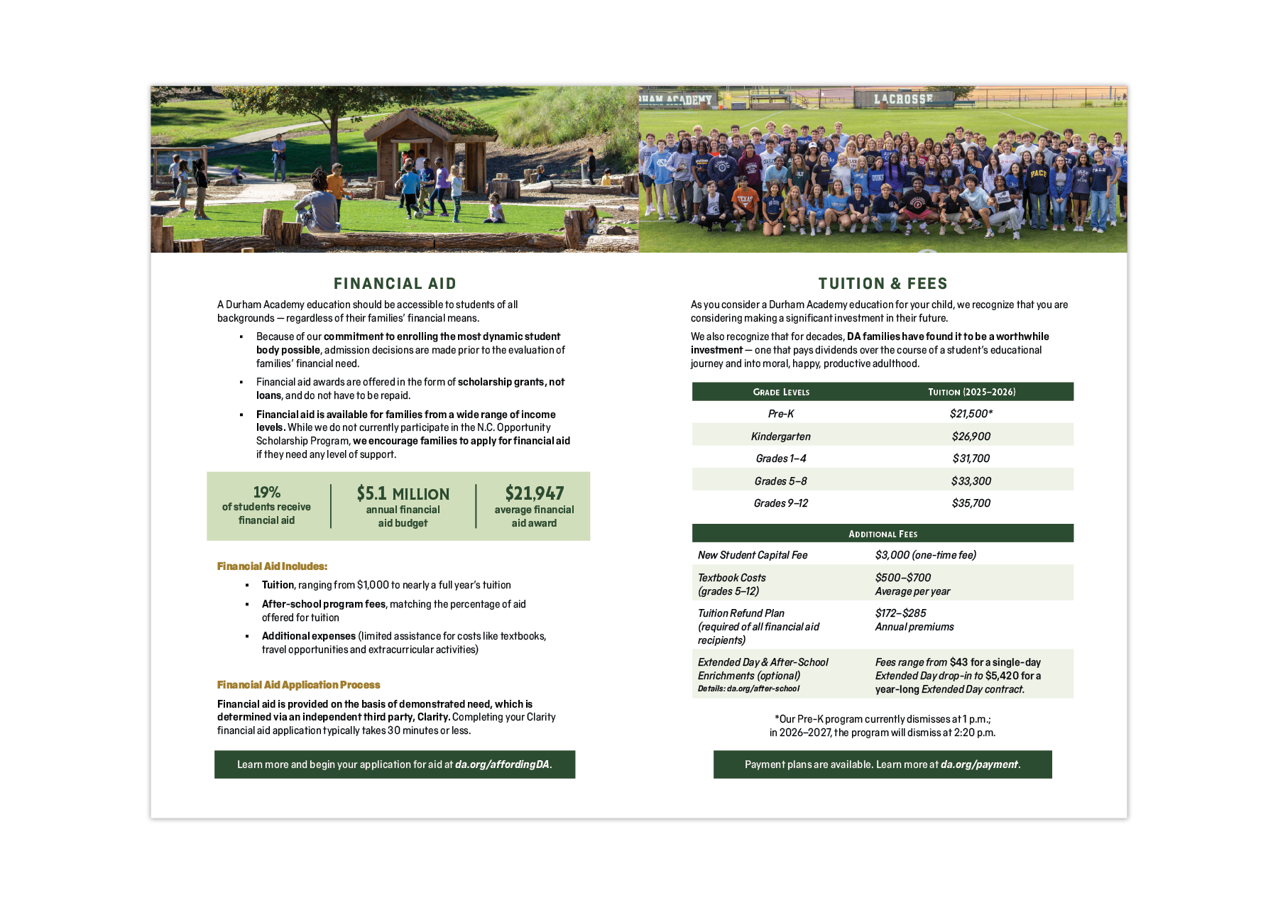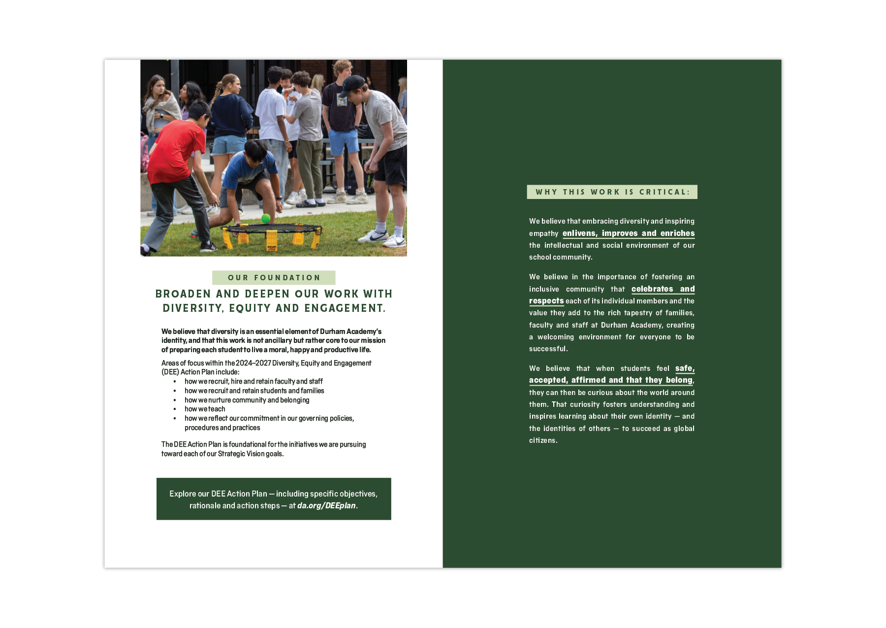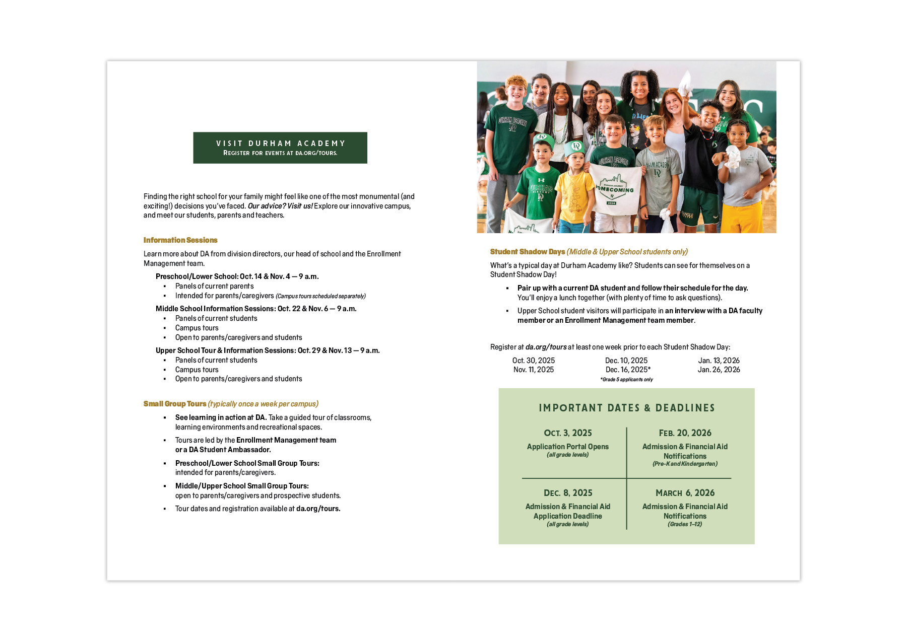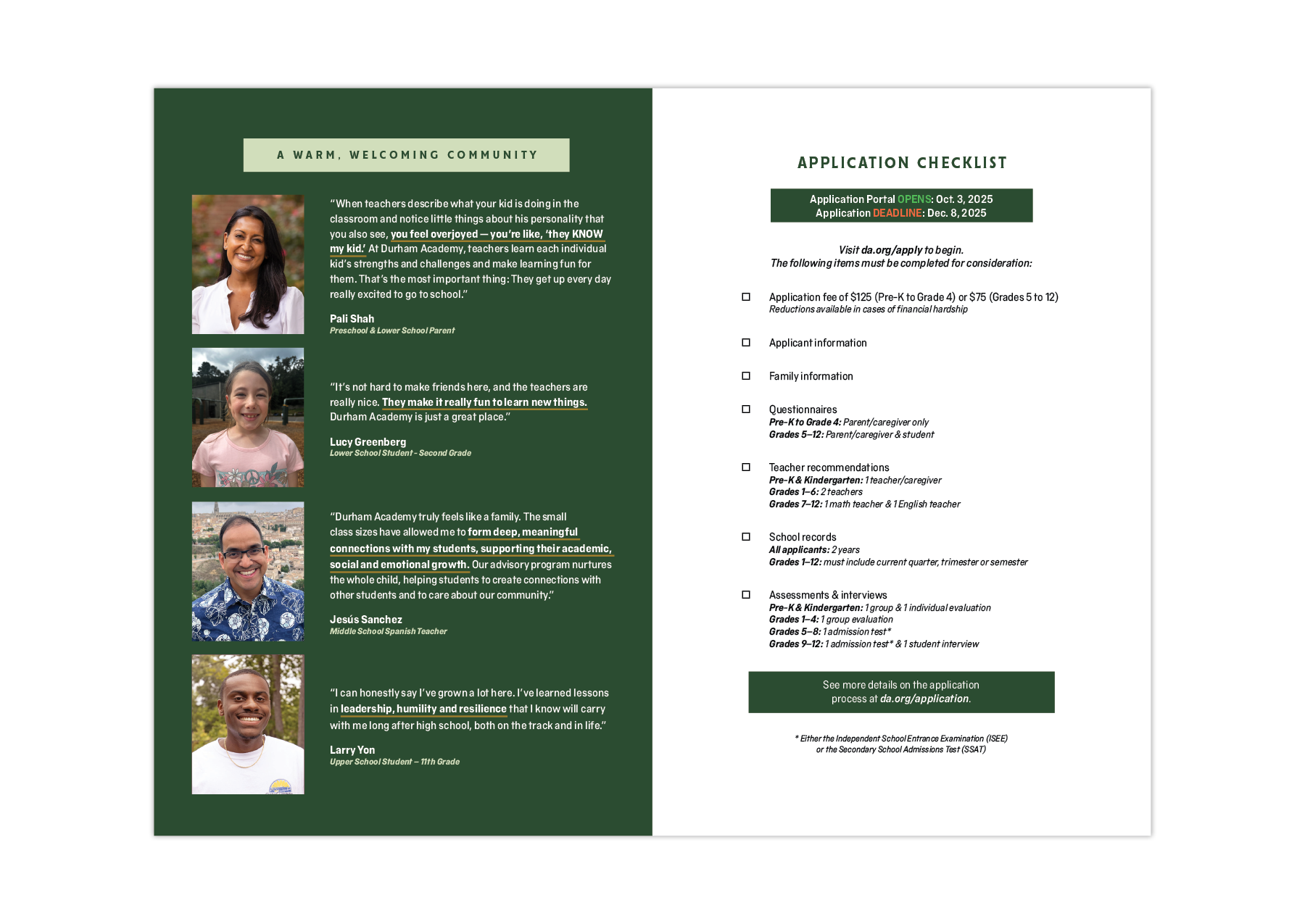 For a 90-year-old institution with a national reputation, our primary admissions collateral wasn't reflecting the caliber of the education we provided. The existing materials—a series of disorganized, fragmented accordion brochures—failed to mirror the sophistication of the school’s strategic direction. In a competitive market where the viewbook often justifies a significant financial investment, the current execution was a missed opportunity to signal quality and rigor. My challenge was to replace this disjointed system with a premium, multi-layered narrative experience that could convince discerning families that Durham Academy is a premier investment in their child’s future.