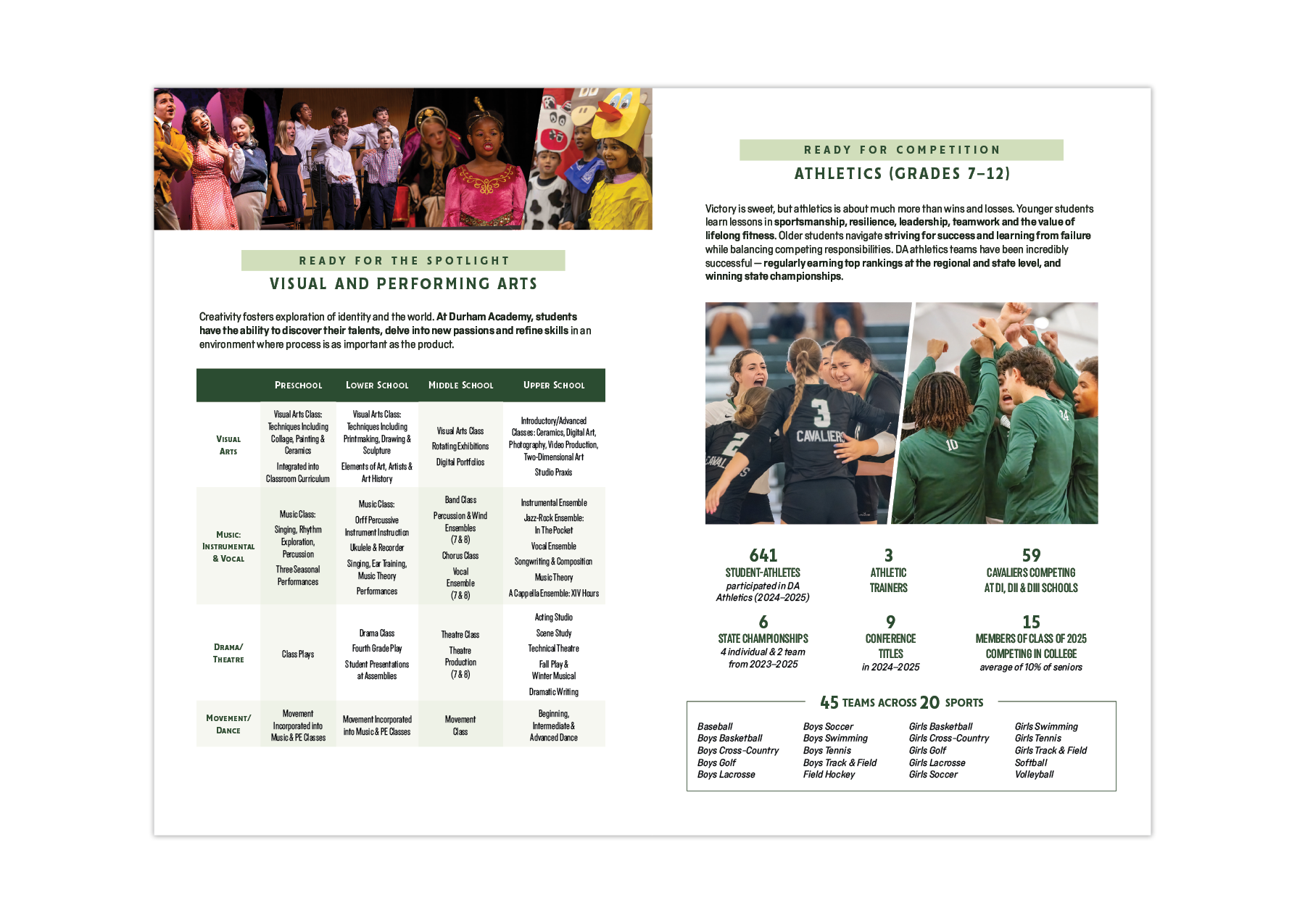I spearheaded a departure from DA's traditional viewbook formats, drawing inspiration from high-end luxury brands to engineer a more tactile and organized information experience. I conceptualized a custom tri-fold system designed to guide prospective families through three distinct 'zoom' levels of the DA story.