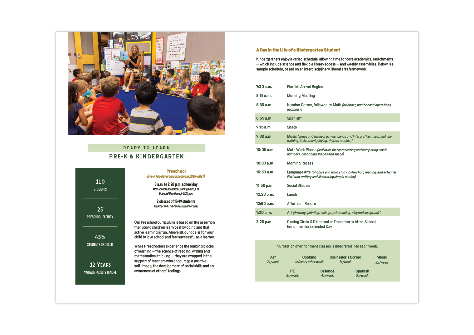 I architected a three-booklet framework—Experience, Educational, and Excellence—to transition the reader from a high-level strategic vision down into the granular details of the classroom and the application process. I served as the bridge between enrollment strategy and creative production, directing the copy, art direction, and specialty print specs—including the selection of textured papers and 'easter egg' design details—to create a sense of discovery. This required a rigorous focus on visual hierarchy and pacing to ensure that the heavy volume of information felt curated, premium, and easy to navigate.